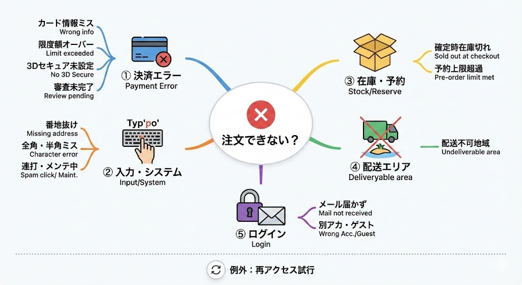 支払いエラー → 入力不備 → 在庫/配送 → アカウント の順でチェックすればほぼ解決できます。
