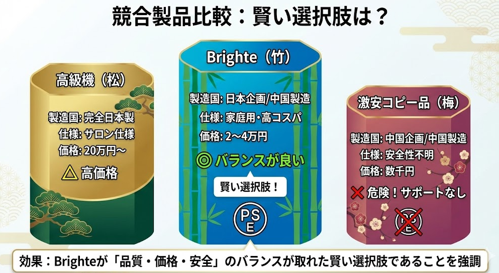 「日本企業が管理しているなら、製造場所は問わないから安く買いたい」という方には、Brighteが合理的な選択肢となります。