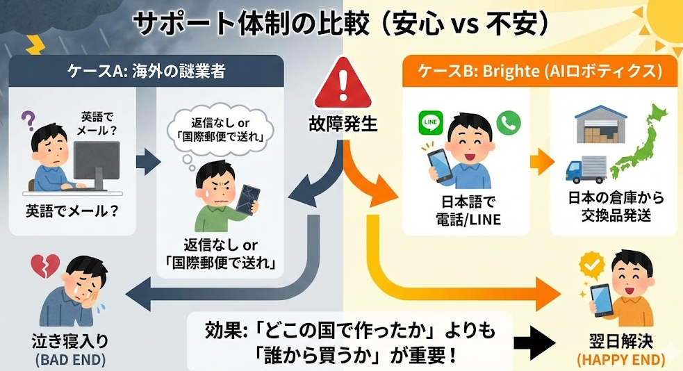 製造工場が海外であっても、販売元がしっかりとした日本企業(株式会社AIロボティクス)であることには、私たち消費者にとって計り知れないメリットがあります。