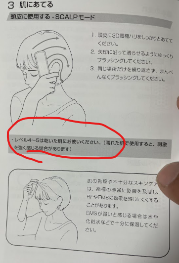 私が所持しているBrighteエレキブラシの取扱説明書(SCALPモードの使用方法)には、以下のような非常に重要な記載があります。
