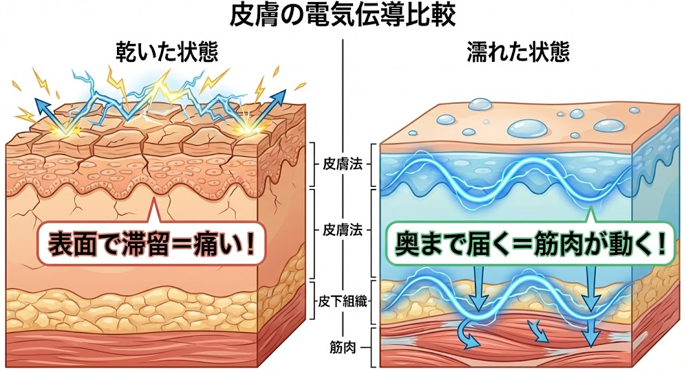 • 濡れた状態(水分あり): 電気抵抗が低い。電気がスムーズに筋肉まで届く。