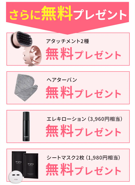- アタッチメント2種類、シートマスク2枚無料プレゼント