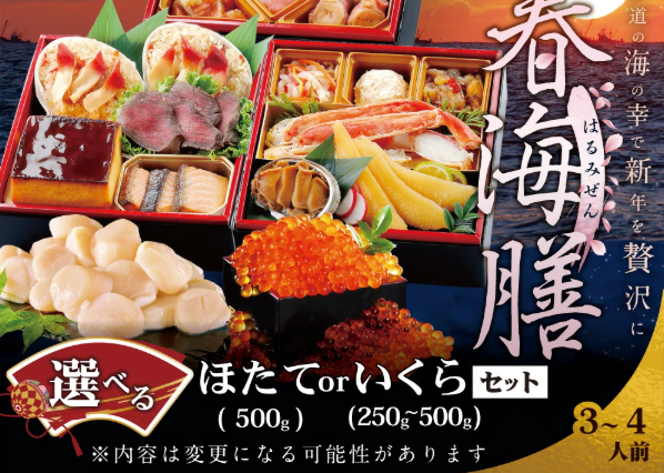 - 内容例:タラバガニ、いくら、ホタテ、数の子、鮭の昆布巻き