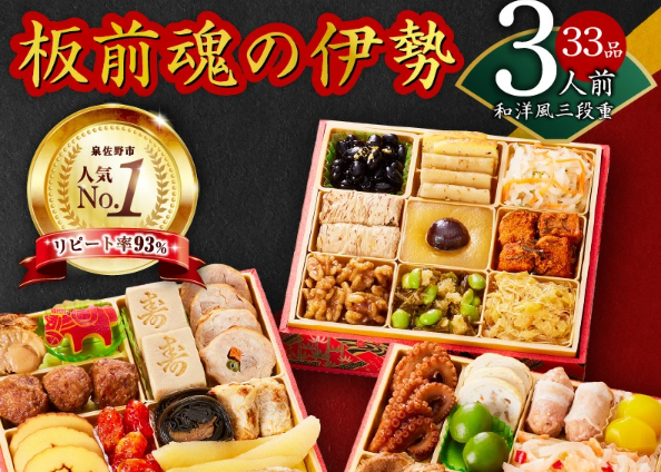 泉佐野市の返礼品として人気の「板前魂」シリーズの中でも、特に支持が高いのが「伊勢」。和洋折衷の三段重で、子どもから大人まで楽しめるバランスの良さが特徴です。