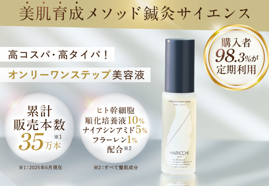 ハリッチ プレミアムリッチプラスは、美容鍼灸サロン「銀座ハリッチ」の知見を取り入れたオールインワン美容液です。
