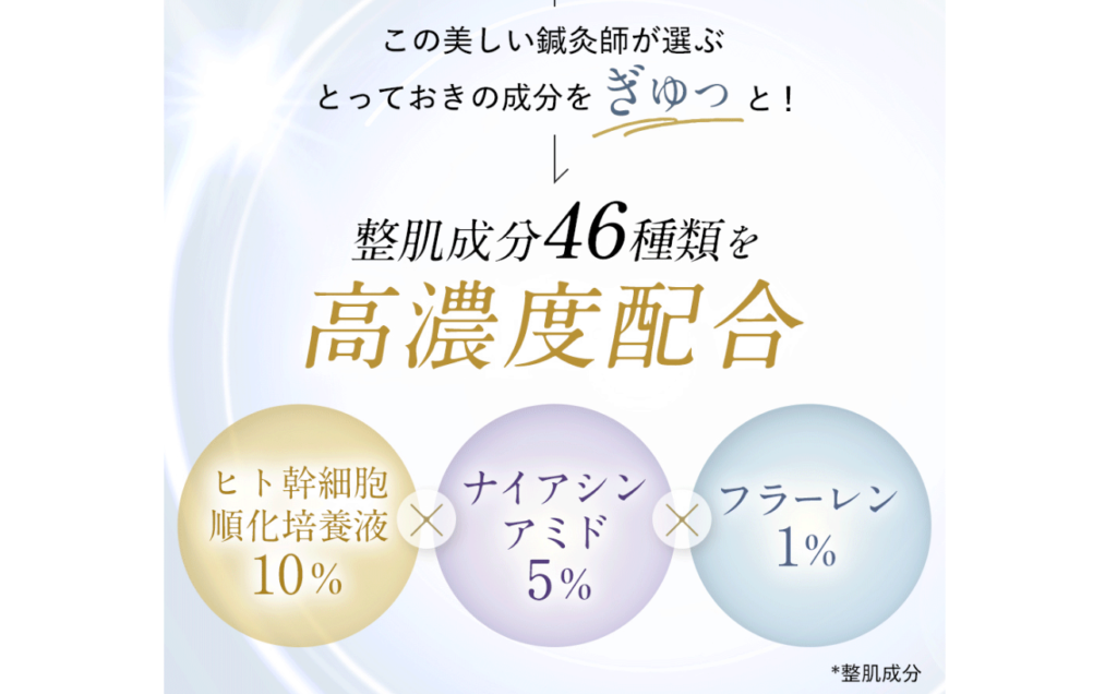 ヒト幹細胞10%・ナイアシンアミド5%・フラーレン1%など高濃度成分を惜しみなく配合し、自宅で美容鍼灸のようなケアを再現できるのが最大の魅力です。