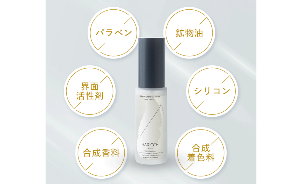敏感肌の人にとっては、美容液の成分や添加物は大きな不安要素です。ハリッチ美容液は「防腐剤・鉱物油・シリコン・合成香料・合成着色料・石油系界面活性剤不使用」という6つのフリー処方を採用しているため、肌が弱い方でも安心して使えます。