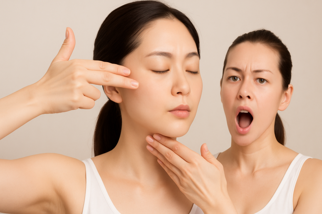 • 口を大きく開けたり、頬を上下左右に動かす簡単なエクササイズは、フェイスラインの引き締めに有効。