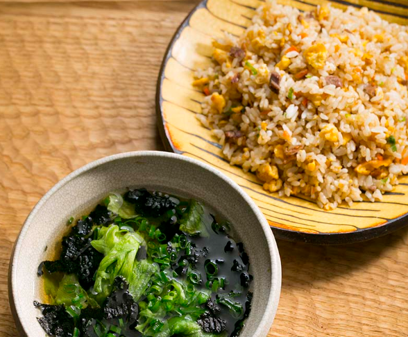 ③直火炒めチャーハン(産直米):北海道産のきらら397を使用し、香ばしく炒めた本格チャーハン。